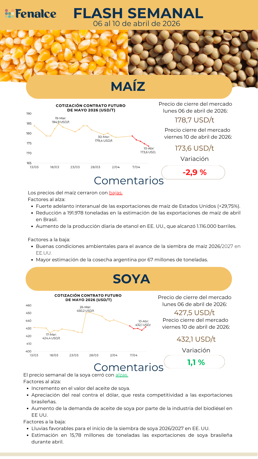 Así se obtienen los Precios Futuros de Referencia para el maíz y la soya importados a Colombia, los cuales están disponibles diariamente, junto con los precios de comercialización del maíz nacional en las principales regiones productoras (Córdoba, Tolima, Meta y Valle del Cauca), así como el precio del maíz trillado en las plazas de abastos de Corabastos (Bogotá) y la Central Mayorista de Antioquia.